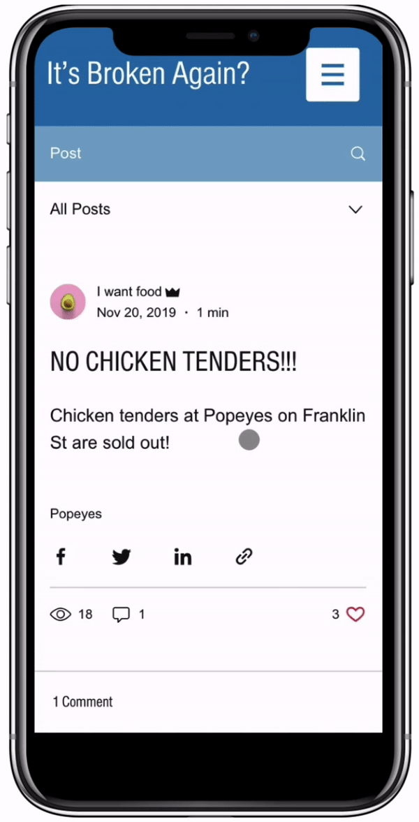 To address a common frustration for food consumers, my team developed "It's Broken Again?" as a solution to the frequent unavailability of items at restaurants. Whether it's a perpetually broken McDonald's ice cream machine or the disappointment of finding Popeyes' chicken sandwiches sold out, customers often face frustration due to equipment malfunctions, supply shortages, or other unexpected issues.